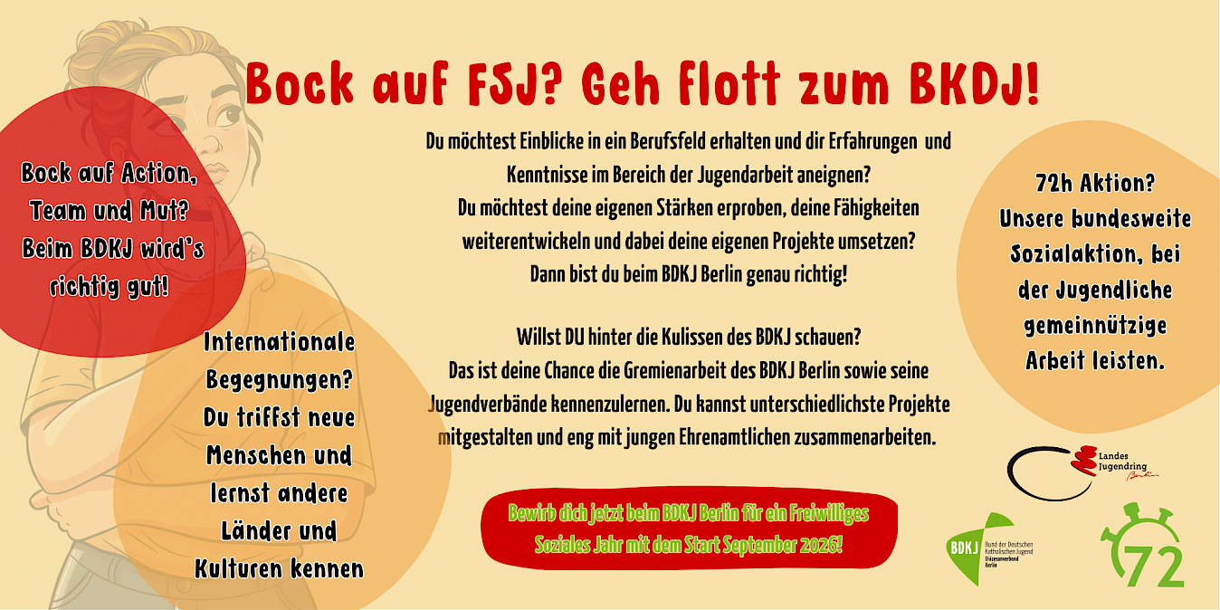 Der BDKJ Berlin bietet dir die Möglichkeit, ein Freiwilliges Soziales Jahr (FSJ) im Bereich der katholischen Jugendarbeit zu leisten. Du kannst Einblicke in ein Berufsfeld erhalten, dir Erfahrungen und Kenntnisse im Bereich der Jugendarbeit aneignen, und dich damit auf deine Berufswahl vorbereiten.